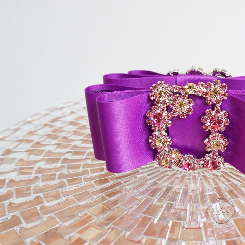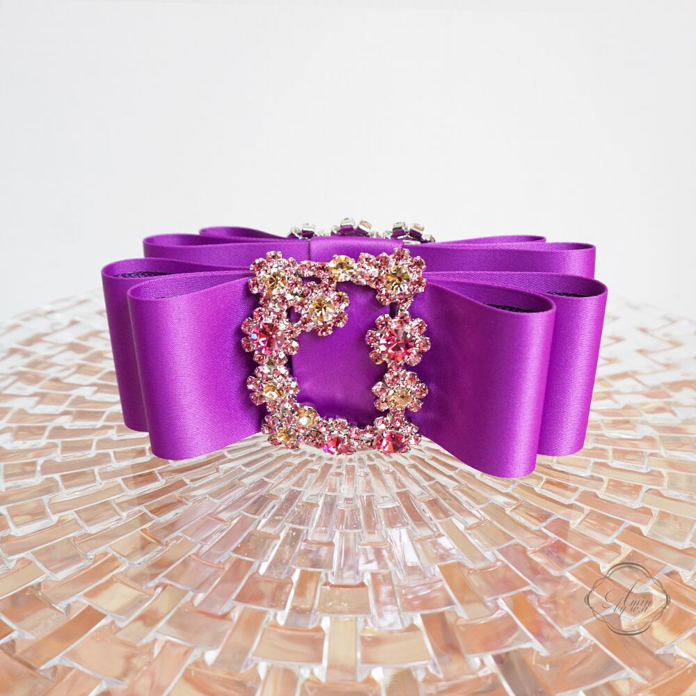バッグルは、輝きが美しい総クリスタルを両サイドのリボンセンターに施しました。