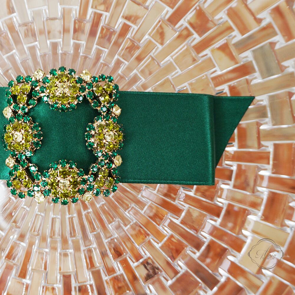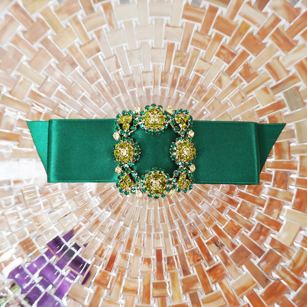 サテンリボンとバッグルは、輝きが美しい総クリスタルをリボンセンターに施しました。