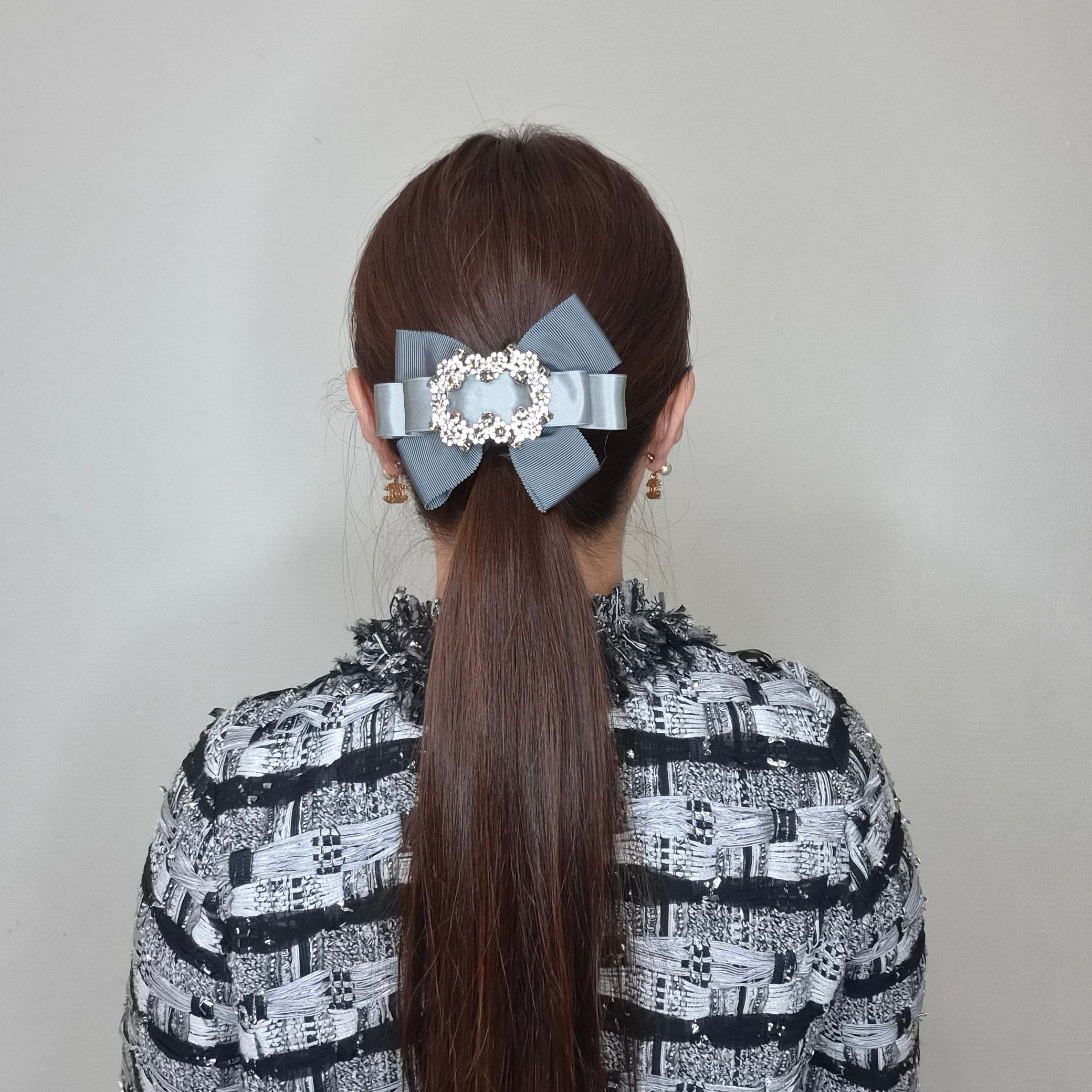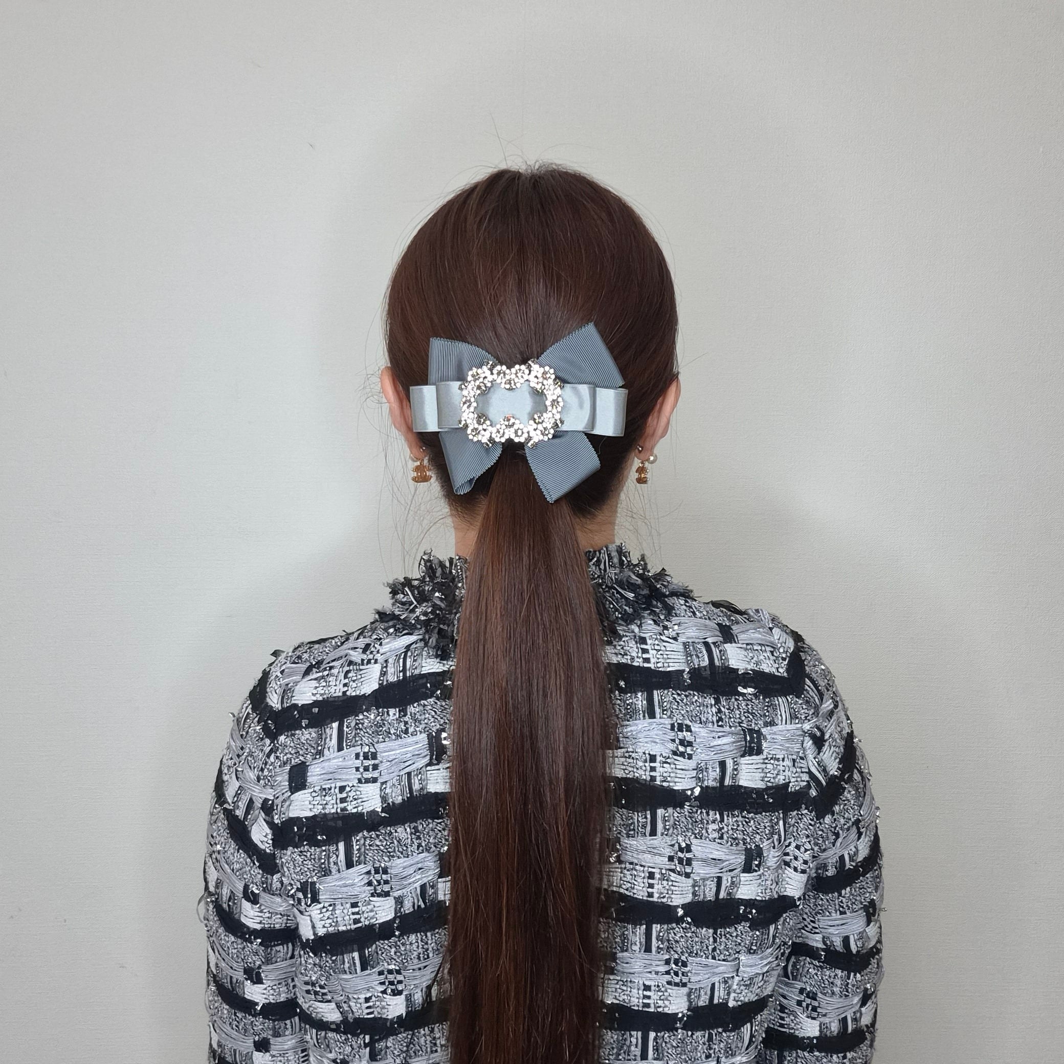 サテンリボンとバッグルは、輝きが美しい総クリスタルをリボンセンターに施しました。
