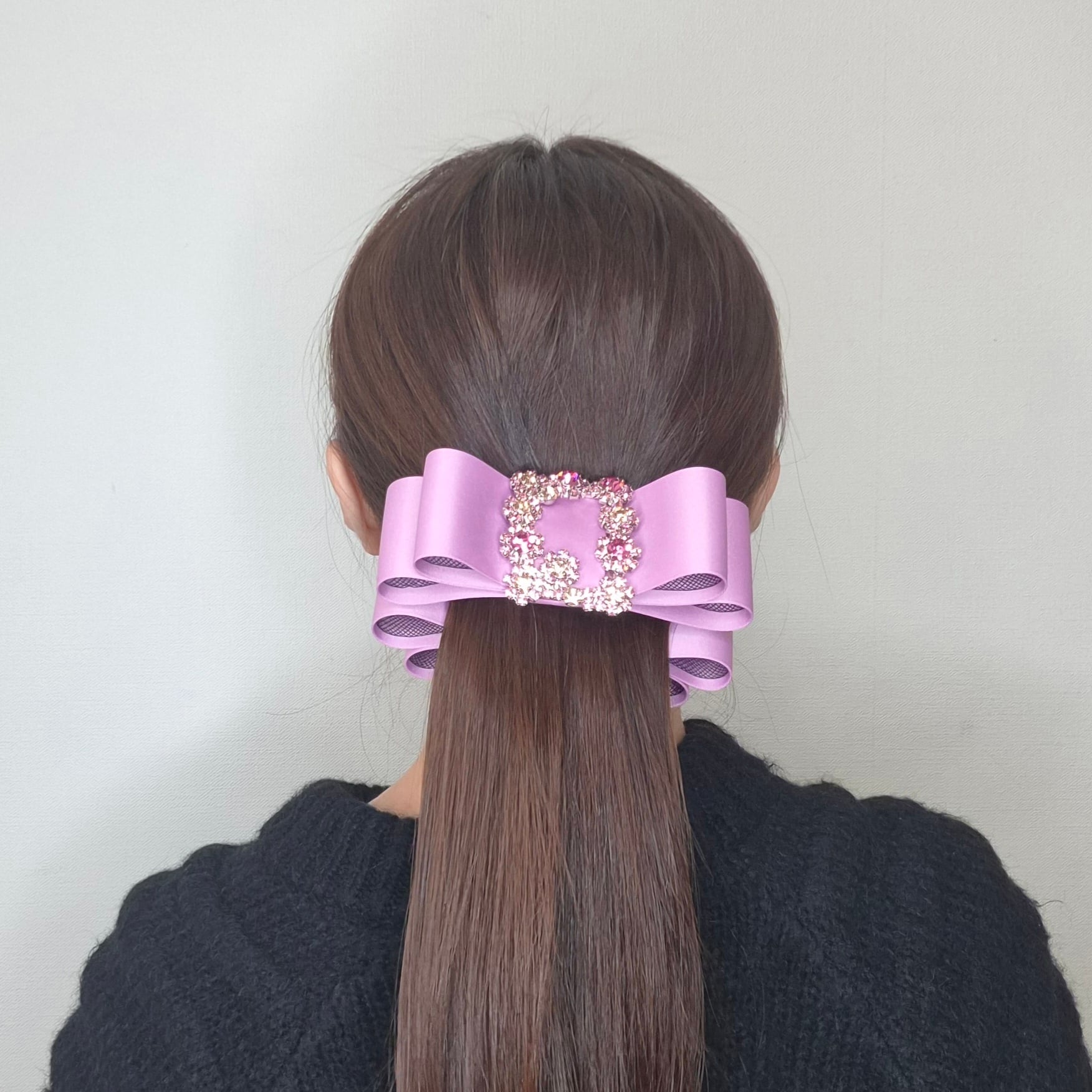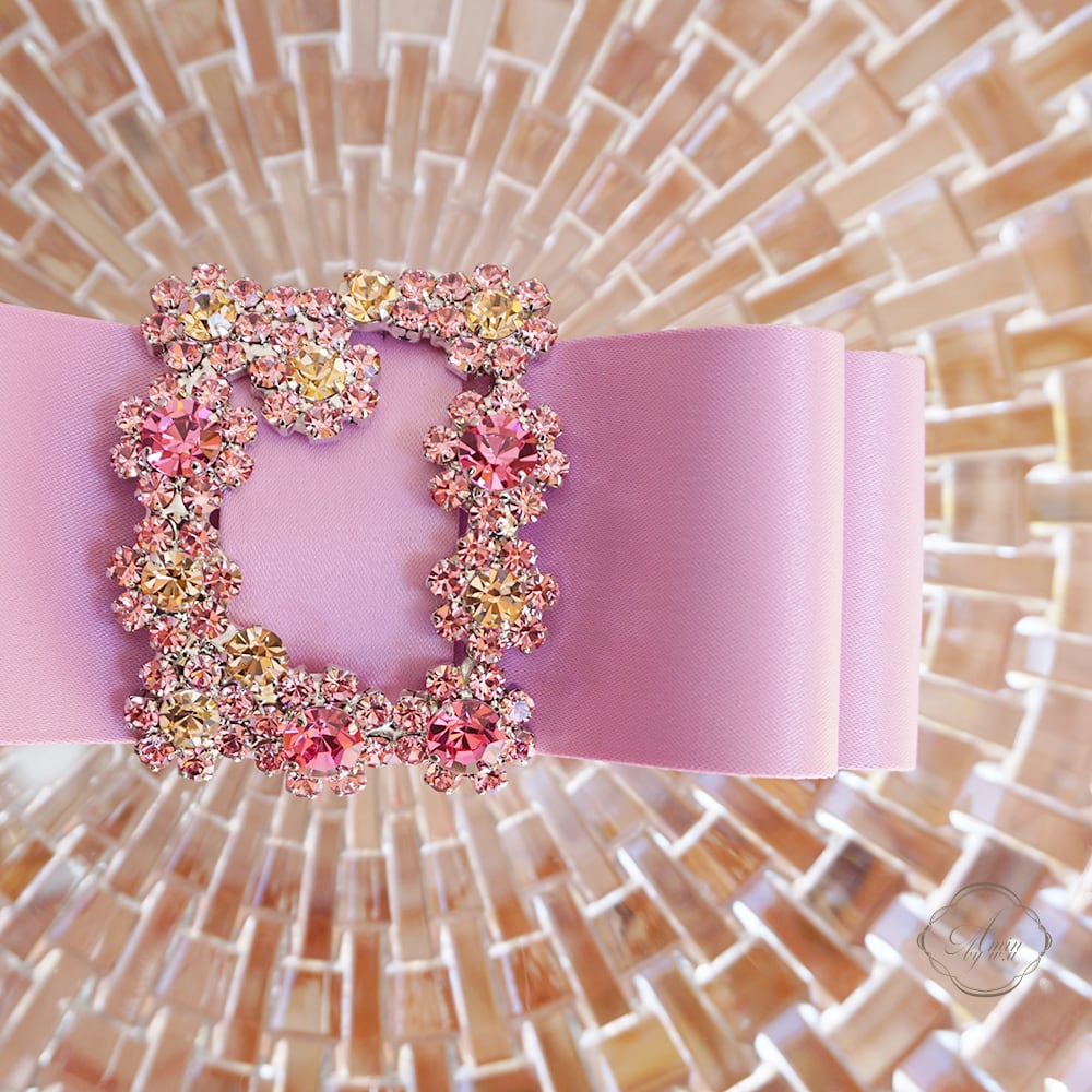 バッグルは、輝きが美しい総クリスタルをリボンセンターに施しました。